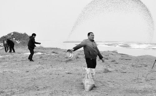 2月7日,郑州黄河湿地自然保护区派出多名工作人员,在中牟县黄河边的最东段,为在郑州黄河湿地栖息的各种野生动物和鸟类投放了500多斤玉米和小麦。