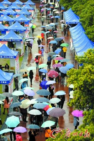 与其他招聘人员不同,在雨中他没有在招聘摊位里面躲雨,而是冒着雨撑着伞直接站在操场上主动地招呼前来咨询的求职者,“你会编程吗?想找什么样的工作呢?”广东科达机电股份有限公司人力资源部招聘主任叶建华在雨中进行着一个又一个的面试。
