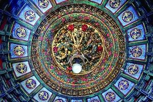 万春亭、浮碧亭、千秋亭、澄瑞亭,是故宫御花园里象征四季的亭子。万春亭、千秋亭为明嘉靖十五年(1536年)建,是一对造型、构造均相同的建筑,仅藻井彩画有细微的差别。两亭均由一座方亭各面出抱厦形成。宝顶是由彩色琉璃宝瓶承托鎏金华盖组合而成,上圆下方的屋顶取仿“天圆地方”的古明堂形制。亭内天花板绘双凤,藻井内置贴金雕盘龙,口衔宝珠。两亭色彩绚丽,造型精美,可称是宫中亭子之最。