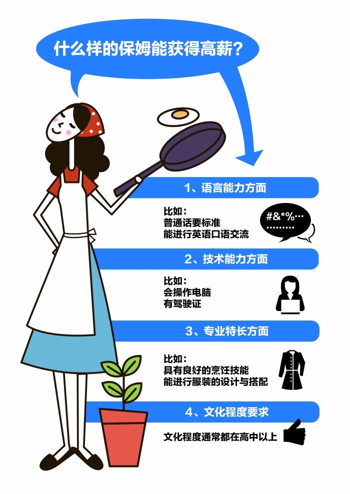 成都泓福泰家政服务公司副总经理王凤明表示,从该公司看,高薪保姆往往都具有专业化技能,客户开出高薪的条件中也往往需要一些专业技能,“从近年来看,主要有大方面,语言能力方面,比如普通话要标准,能进行英语口语交流等,技术能力方面,比如会操作电脑,要有驾驶证,专业特长方面,比如具有良好的烹饪技能、能进行服装的设计与搭配等,文化程度通常都在高中以上。”(记者 韩利)