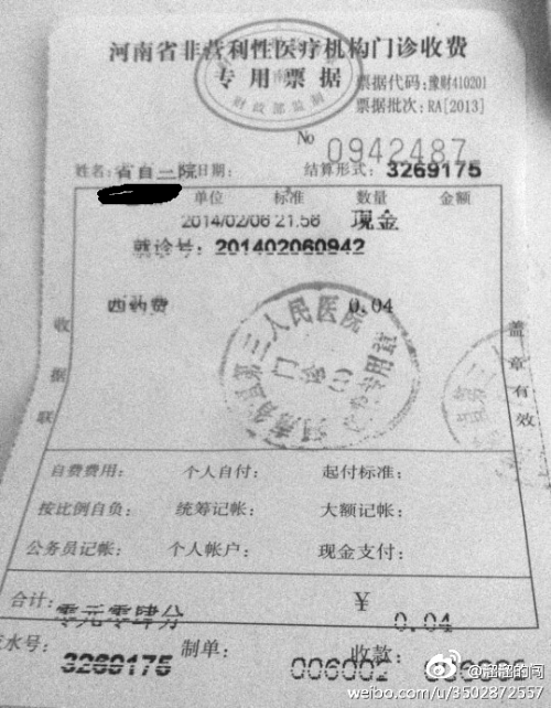 2月7日13时17分,网友@溜溜的闯发了一条微博:头天晚上9点多,2岁多的孩子出红疹,像是皮肤过敏。跑了好几家药店都关门了,就步行到稍远的河南省直三院。在儿童病房,一女医生问明情况后给开了4片扑尔敏。划价时,本想着得好几元,结果是:4分钱!我给1毛,不用找了。这个处方或许不代表什么,但的确让我觉得值得纪念。谢谢医生!