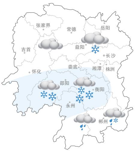 今晚到明日:湘南阴天有小雪,其他地区阴天间多云。