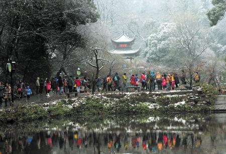 长沙迎来新春首场大雪。“麓山赏雪”成为不少市民的选择,昨日爱晚亭前游客扎堆。 石祯专 摄