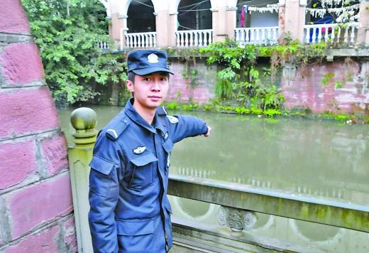 昨日,民警卓光秋为记者指出刘女士跳河的位置。 区公安供图