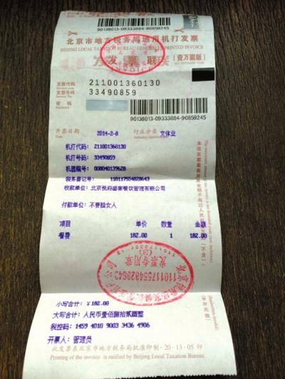 昨天中午,名为“请叫我疙瘩”的微博网友上传一张就餐发票的照片。该发票的开具日期为2月8日,付款单位为“不要脸女人”。该微博称博主就餐开发票遭到“人身攻击”。据该网友曹女士介绍,她与朋友在2月8日中午12点多到位于三里屯的粤北小城餐厅就餐,“我吃饭有开个人发票的习惯,一方面是方便维权,另外也想看有没有中奖。吃完饭后服务员说店里暂时没有发票,就找同层的便宜坊饭店帮忙开了发票”。