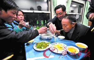 2009年1月14日,L7602次广州到衡阳列车上,老家在衡阳的几个老乡正在列车餐车上提前吃团圆饭。记者邵权达 摄
