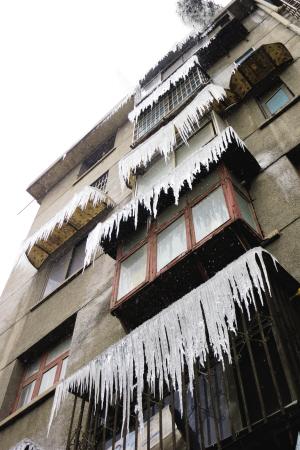 附近居民说,该楼从10日晚上起楼顶就开始漏水,没想到早上起来,发现不少窗户上都挂满了冰锥。刘女士担心,漏到地上的水结成冰后,市民一不小心就会滑倒。另外,楼上的冰锥一旦落下,很容易伤人,她希望有关部门部门能前来除冰排险。