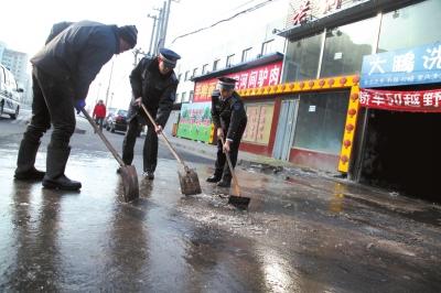 在丰台区嘉园路上,城管队员在对店主进行批评后,一起除冰。京华时报记者欧阳晓菲摄