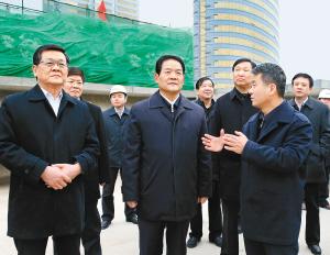 2月11日,省委常委、市委书记魏民洲,市长董军带领市级相关部门调研城墙南门区域综合提升改造项目, 市领导岳华峰、吕健、段先念一同参加调研。图为在南门外松园实地考察护城河水上游览项目建设进展情况。 记者李欣 魏影 摄