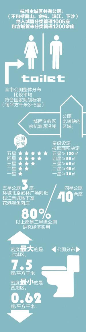 目前杭州的公厕根据面积,分成五星、四星、三星、二星和一星五个档次。其中,五星级公厕要求面积大于等于150平方米,全杭州就3座,分别位于环城北路武林广场附近、钱江新城地下室和花港观鱼蒋庄附近;四星级公厕要求面积大于等于80平方米,全杭州40余座;而80%以上的公厕都是三星级公厕,面积大于等于60平方米,以经济实用为主。