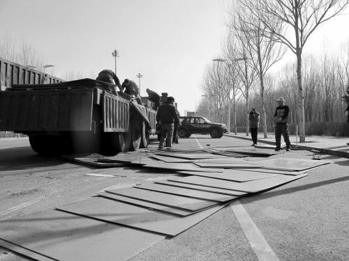大挂车转弯太急 车上70张钢板飞出来砸路上(图)