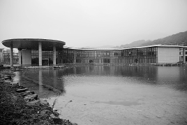 杭州市第三福利院东临天都城、南近千桃园、北靠皋亭山。整个园区楼房的外观已基本建设完毕,住宿楼黄色的外墙加上白色的柱子,在小雪中很打眼;呈“C”字型的为老服务中心大楼前,云湖水波光粼粼。西区道路已经铺好,锻炼器械都到位了。