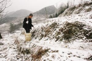 “全村200多户,现在有一大半需要挑水吃。”村民老张说,加上打工回来的儿子、媳妇和孙子,他家五口人、两头猪、一头牛,每天要6挑水才够。虽然挑水的泉眼不远,平时10分钟就能到,现在冰雪覆盖了山道,挑一次水大约要20多分钟。