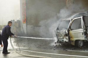 民警见状,从警车上取下灭火器扑救。同时,要求20多米外的加油站立即停业、断电,启动应急预案,并打电话到派出所,请值班民警调派专职消防人员增援。据了解,数分钟后,三合镇消防队开着消防车赶到,很快扑灭了大火。不过,这辆面包车已被烧得面目全非。