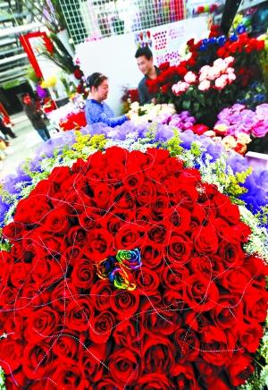 “是来看红玫瑰的吧?最便宜的10元,还有15元和18元的。”一位年轻人刚刚走进北京师范大学附近的一家花店,就直接被老板小张招呼上了。“11支多少钱?”“看你要什么配草和包装了,快300元吧。”看着年轻人不再接话,小张开始滔滔不绝地介绍,“要不你买这个带小熊的,女孩子应该挺喜欢;还有我们这个‘永生花’,可以一直开下去,一朵装到礼盒中,也就百八十块,可以象征你们爱情长长久久。”