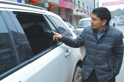 车主指着被砸坏的车窗。