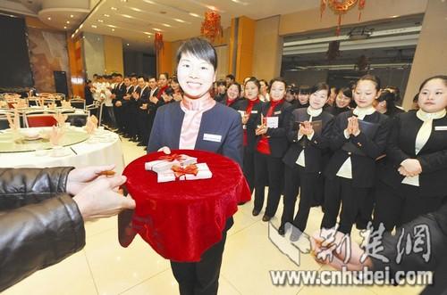 昨日下午,亢龙太子酒轩雄楚店召集所有员工开会,表彰鼓励徐慧拾金不昧的精神,将其职务晋升一级,并现场发放两万元奖金。亢龙太子酒轩负责人称,该公司一向重视培养员工的道德素质。不管员工拾获上交的是100元还是20万,酒店都会进行表彰。当时,挎包所在的位置属于监控盲区,徐慧发现巨款后没有任何犹豫,立即上交。酒店重奖徐慧,正是希望全体员工学习她拾金不昧的道德品质。