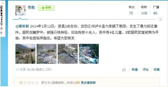 2月13日,有腾讯网友微博爆料称“凌晨2点左右,在怒江州泸水县六库镇下赖茂,发生了暴力拆迁事件。居民在睡梦中,被强行挟持后,非法拘禁十余人,其中有4名儿童。8家居民家屋被夷为平地,其中包括裕祥鱼庄。该事件被曝光后引发社会关注。