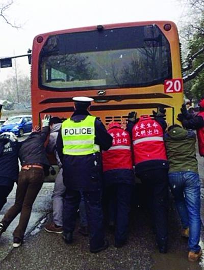 公交车早高峰抛锚 南京10多位警民雪中携手推车