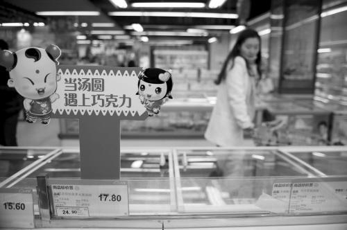 在这家店里,传统的馅料汤圆统一售价为17.9元,只有巧克力馅和玫瑰馅的涨价2元钱。促销人员介绍说,选择什么馅料的汤圆,关键在于个人口味,但是,年轻人购买巧克力馅和玫瑰馅的比较多,也不见得他们就喜欢那个味儿,多数人是因为情人节这个日子,选点儿特别的。巧克力馅的汤圆虽然价格高,但是销路非常好,每天都在不停地补货。
