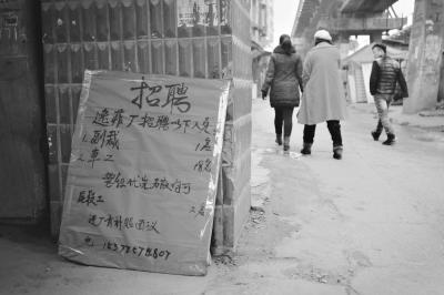 13日,汉口华安里社区附近的工厂门口摆放着招聘告示,该厂还有20多人的用工缺口。见习记者 胡琴沁 摄