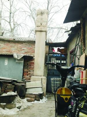 碑身东侧部分紧贴一民居墙壁,而北侧被人堆放了一米高的砖堆,碑西侧地面上也堆了些砖瓦和生活杂物。此外,石碑碑首上捆了一圈红钢丝线,线的另一边拴在西侧房檐边砖缝上。“这是后来拴上的,方便大伙儿晒衣服,杂物也是后来堆放的。”一位从屋里出来倒水的居民称,对于堆放杂物是否会损坏文物的质疑,他表示,“没办法,不搁这儿没地儿放啊,何况大杂院里也没人注意。”