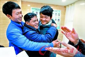 打开亲子鉴定报告,看到结果显示张铭真的是失散多年的亲人,郑双平(中)、大儿子与张铭(右一)高兴得抱成一团,旁边的志愿者也拍掌庆祝。记者苏俊杰 摄