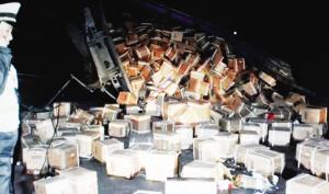 一辆遵义籍大货车在兰海高速重庆市境内失控后,冲出高速公路,导致车内价值上千万元的茅台酒受损,车内1名乘客身亡,司机受伤。