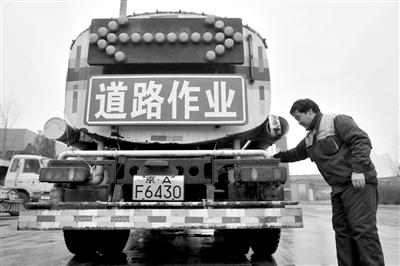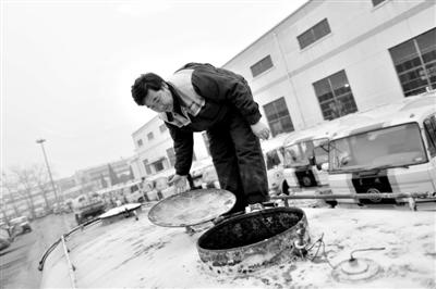 昨日,北京环卫集团,洒水车司机魏良利在发车前检查水箱。持续雾霾天气,环卫集团的洒水清扫车辆增加出勤。本版摄影/新京报记者 薛珺