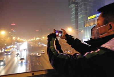 昨晚,邹毅拍摄雾霾下的北京。他曾连续365天用手机拍摄记录北京的天气变化。新京报记者 王叔坤 摄