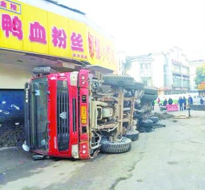 昨天上午,扬子晚报记者来到位于南京市秦淮区平江府路与建康路路口的事故现场。此时,重型载货车已经被交警部门调来的拖车拖走,地面上还留下了一个直径一米多长,30公分深的椭圆形深坑,工作人员正在清理事故现场遗留下来的渣土,并在深坑四周设置障碍物。一位目击者告诉记者,当天清晨5点多,天刚刚亮,路上行人还不多,这辆渣土车突然侧翻在路边。“当时听到了一声巨响。”这名目击者赶到现场时,渣土车已经侧翻在路边,随后司机从驾驶室内爬了出来。目击者告诉记者,司机爬出来也觉得很奇怪,怎么开得好好的就会侧翻,最后司机在侧翻的车身下找到了答案。原来,这辆车右侧车轮所处的地面已经塌陷,右侧车轮失去地面支撑,所以整个车身会向右倾斜,导致侧翻。