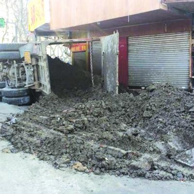 黑渣土车侧翻在路边,渣土抛撒一地。 季宇轩 摄