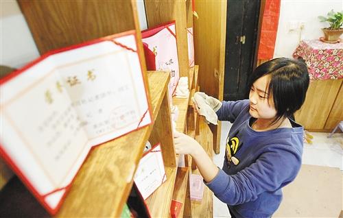 近日,放假在家的苏崟正在做清洁,柜子上摆满了她的各种获奖证书。