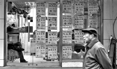 昨日,东城东花市一家房产中介门店窗户上贴满了房屋租售信息,但更多信息都被发在了各大网站上。新京报记者 周岗峰 摄
