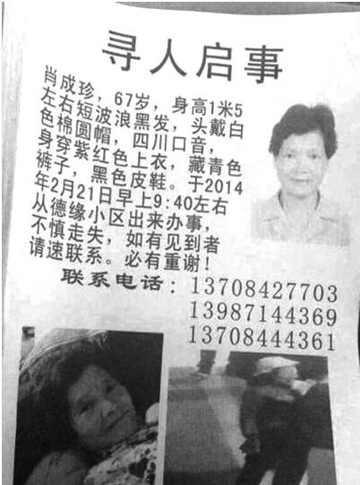 可怜天下父母心。得知自己患了癌症,67岁的肖成珍不愿拖累家人,悄悄离家出走。而她的儿子和亲友焦急万分,彻夜寻找。截至昨日下午,肖成珍已经失踪3天了,小儿子肖川也找了3天。