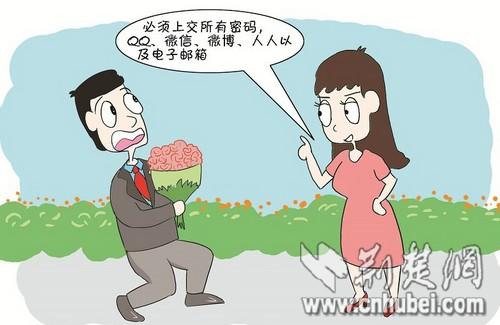 前日,面对男友的求婚,武昌张小姐开出如下条件:必须上交所有互联网密码,QQ、微信、微博、人人以及电子邮箱无一例外,称唯有如此,才是“真爱”,男友顿时觉得“难以呼吸”。