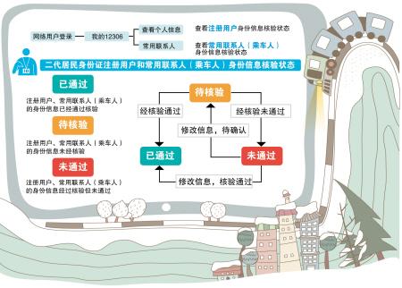铁路部门介绍,如果注册用户、常用联系人(乘车人)的身份信息未经国家身份认证权威部门核验,核验状态会显示为“待核验”。需要用户确认在12306网站所填写的身份信息内容与二代身份证原件完全一致后,持二代身份证原件到车站售票窗口或铁路客票代售点办理核验。