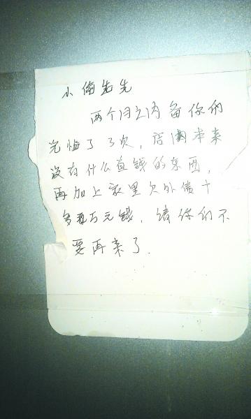 记者在店门上看到,一张纸条上用歪歪扭扭的字迹写着:“小偷先生,两个月之内备(被)你光临了3次,店内本来没有什么值钱的东西,再加上家里欠外债十多万元,请你们不要再来了。”