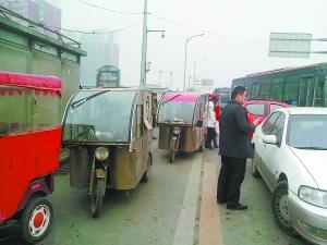 记者注意到,这些黑车大都聚集在556路等停靠的公交站台附近,严重妨碍了公交车进站与乘客上下车。记者发现,不仅在马路边上,就连人行道上也停放着七八辆黑三轮车,几乎挡住了整条道路,行人难以通行。行人李女士告诉记者:“这里常年都停着几十辆黑车,占了公交专用道和公交站。要是赶上早晚高峰时,公交车几乎进不了站,乘客只好在黑车中来回穿行,才能上车。太乱了。”“地铁A出口附近本来就是个交通枢纽,多条公交线路与地铁都在这里换乘,客流量很大。我每天晚上一出地铁,就被黑车挡在公交站的外面了,进站的公交车也不得不停在站外,还经常与黑车发生剐蹭,特别危险。”在附近工作的赵先生也向记者抱怨。