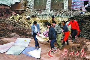 工地工人与家属合力把死者遗体从工地抬离。记者苏俊杰 摄