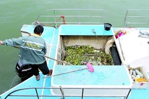 一人船头驾驶,一人船尾打捞,每船两人是水上环卫工作的基本配置。打捞时必须保持站立,长时间日晒雨淋很难受,小刘和老范两人就轮流开船。