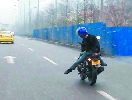 男子马路上秀摩托“杂技”引追拍 双脚站立座上