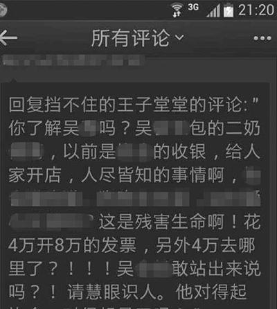 昨天上午,记者也从吴先生处查看到相关微博信息。吴先生告诉记者,发该微博的时间应该在2月25日前后(目前该条微博已被删除),而这条微博最初是由“挡不住的王子堂堂”发出的,该条微博在网上出现后,“快乐大笨笨傻乎乎”、“风一样的陌上初薰”、“爱护生命2001”、“用户3410862920”、“小凤仙_89985”等微博用户对该帖子进行“围观”及点评。