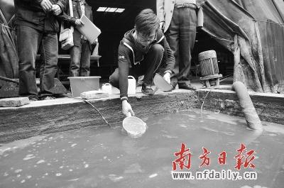 环保局工作人员对污水进行抽样检查。 戴嘉信 摄