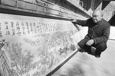 近日,廊坊市大城县70岁农民杨孟和,历时3个半月,用电烙铁“烙”出了长7.8米,宽0.7米,由4部分组成的烫画《清明上河图》。