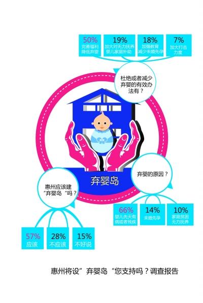 日前,惠州本地论坛发起网络调查,了解网民对弃婴岛的态度。截至昨日下午6点,共有300人参与调查。结果显示,近六成网民赞成建岛,认为此举可以避免弃婴陷入危险,保护生命;近三成网民认为这会变相纵容弃婴行为,甚至可能导致弃婴数量的增加。更多的人选择了保护幼小的生命。