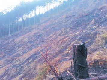 被烧毁山林仍留下许多灰烬和树枝。