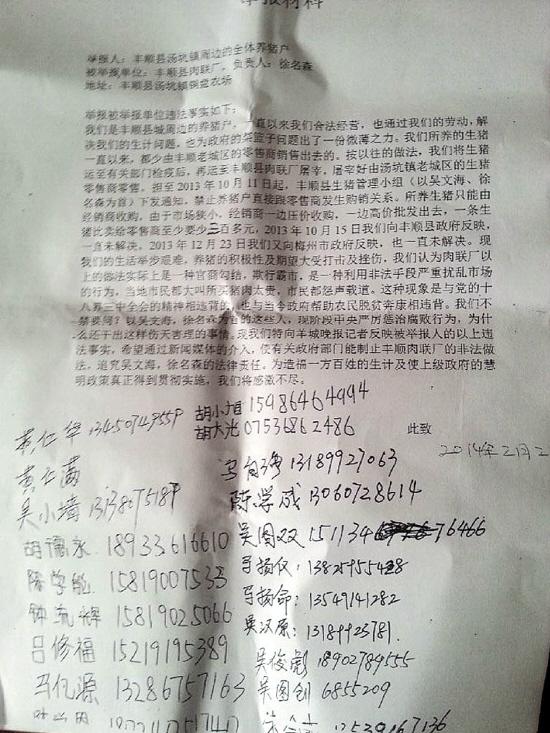 3月2日,几十户生猪养殖户再向记者递来了“举报材料”称:“我们都是养殖合法经营,是通过自己的辛勤劳动来解决生计问题,所养的生猪一直以来都主供丰顺县城市场。养殖户还说:以往,也将生猪运至经有关部门检疫后再运至丰顺县肉联厂集中屠宰,屠宰后再由零售商进行批发和零售。丰顺县生猪管理办公室以吴文海、徐名森为‘领导’的曾下发通知:‘禁止养猪户直接将生猪跟零售商发生购销关系。所养生猪只能由10位经销商收购’。由于市场狭小,在生猪养殖近年来连连亏损的情况下,养殖户认为:经销商一边压价生猪收购,一边却高价批发猪肉,这样一来,一头生猪卖给零售商至少要亏300元。”