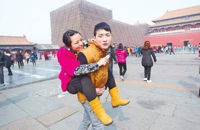 冯莹第一次来北京,在天安门附近走累了,海斌背着她。