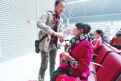 在郑州候车时,冯莹和丈夫杨海斌一刻也不愿分开。到哪冯莹都会拉着海斌的手。而海斌也会不停地搂着冯莹,两人紧紧依偎着。